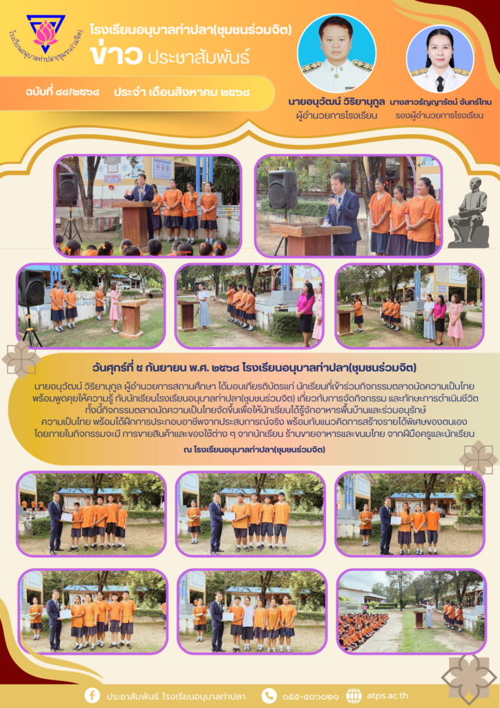นายอนุวัฒน์ วิริยานุกูล ผู้อำนวยการสถานศึกษา มอบเกียรติบัตรแก่ นักเรียนที่เข้าร่วมกิจกรรมตลาดนัดความเป็นไทย 5 กันยายน 2568 ATPS ข่าวประชาสัมพันธ์, จดหมายข่าวประชาสัมพันธ์ FacebookFacebookXXLINELine ATPS