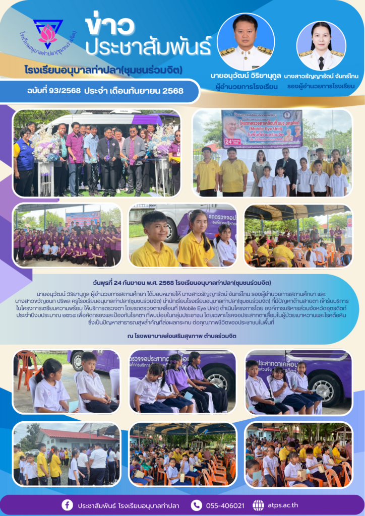 นายอนุวัฒน์ วิริยานุกูล ผู้อำนวยการสถานศึกษา ได้มอบหมายให้ นางสาวธัญญารัตน์ จันทร์โทน รองผู้อำนวยการสถานศึกษา และ นางสาวขวัญชนก ปริพล ครูโรงเรียนอนุบาลท่าปลา(ชุมชนร่วมจิต) นำนักเรียนโรงเรียนอนุบาลท่าปลา(ชุมชนร่วมจิต) ที่มีปัญหาด้านสายตา เข้ารับบริการในโครงการเตรียมความพร้อม ให้บริการตรวจตา
