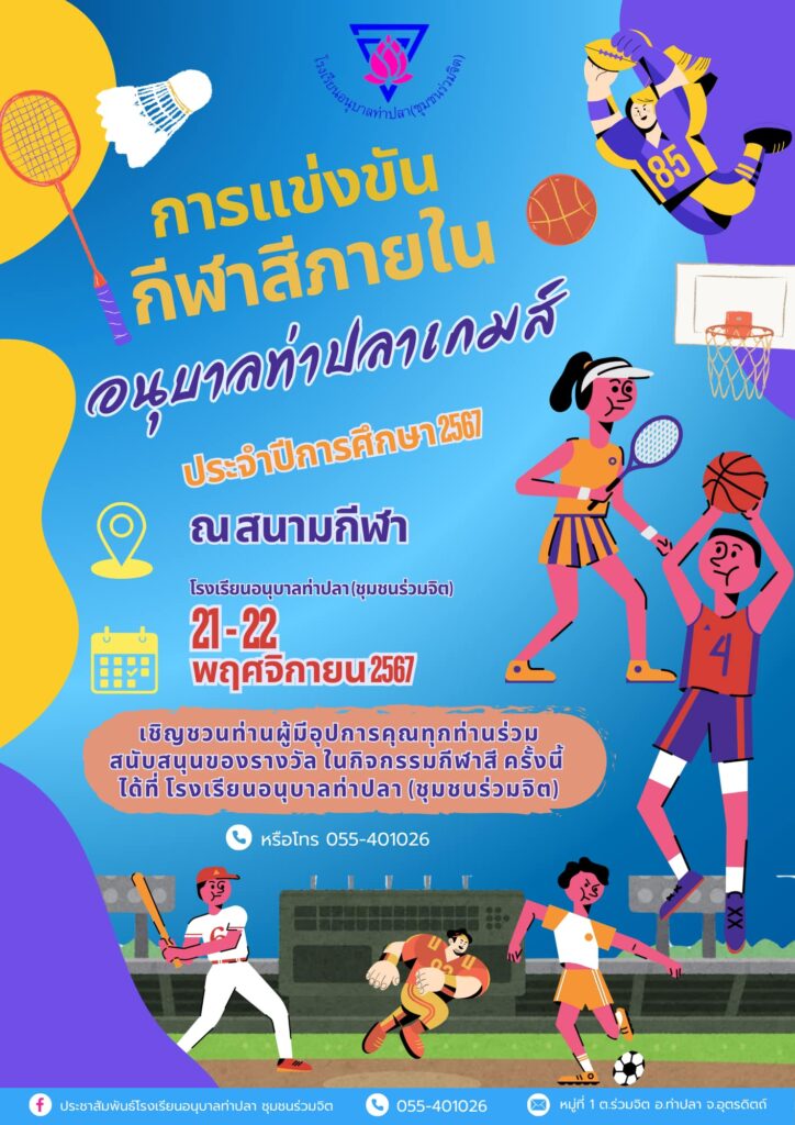 ประชาสัมพันธ์เชิญชวน นักเรียน ผู้ปกครอง คณะครูและบุคลากรทางการศึกษา โรงเรียนอนุบาลท่าปลา (ชุมชนร่วมจิต) เข้าร่วมชม ร่วมเชียร์ กีฬาสีภายใน ประจำปีการศึกษา 2567 ระหว่างวันที่ 21- 22 พฤศจิกายน 2567 ณ สนามกีฬา โรงเรียนอนุบาลท่าปลา (ชุมชนร่วมจิต) และเชิญชวนท่านผู้มีอุปการคุณทุกท่านร่วมสนับสนุนของรางวัล ในกิจกรรมกีฬาสีครั้งนี้ ได้ที่ โรงเรียนอุนบาลท่าปลา (ชุมชนร่วมจิต) หรือโทร 055-401026