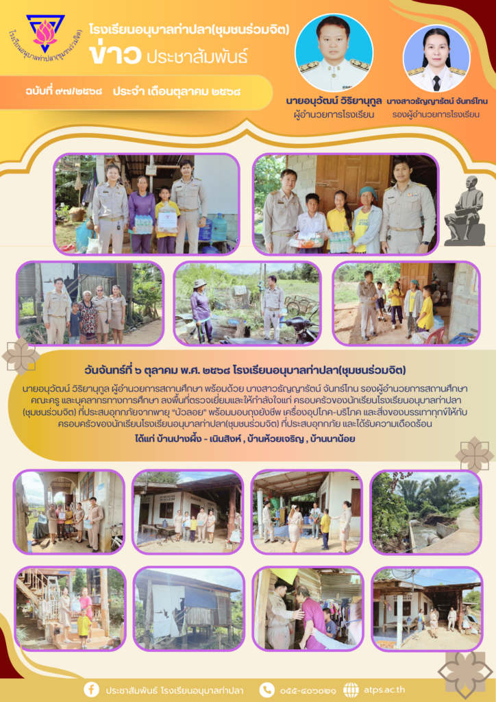 ลงพื้นที่ตรวจเยี่ยมและให้กำลังใจแก่ ครอบครัวของนักเรียนโรงเรียนอนุบาลท่าปลา(ชุมชนร่วมจิต) ที่ประสบอุทกภัยจากพายุ “บัวลอย” พร้อมมอบถุงยังชีพ เครื่องอุปโภค-บริโภค 6 ตุลาคม 25686 ตุลาคม 2025 ATPS ข่าวประชาสัมพันธ์, จดหมายข่าวประชาสัมพันธ์ FacebookFacebookXXLINELine ATPS