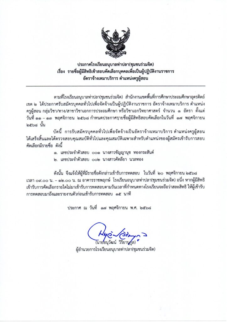 เรื่อง รายชื่อผู้มีสิทธิเข้าสอบ คัดเลือกบุคคล เพื่อเป็นผู้ปฏิบัติงานราชการ อัตราจ้างเหมาบริการตำแหน่งครูผู้สอน 17 พฤศจิกายน 2568 ATPS ข่าวประชาสัมพันธ์ FacebookFacebookXXLINELine ATPS