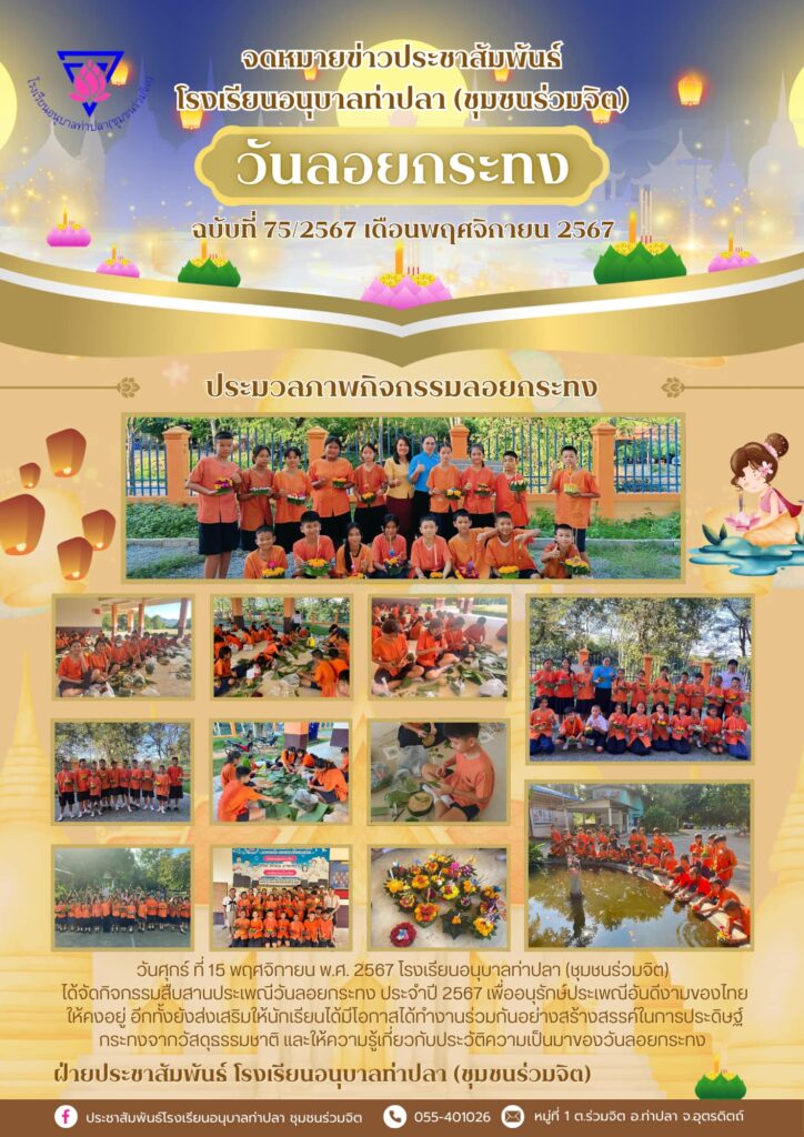 จัดกิจกรรมสืบสานประเพณีวันลอยกระทง ประจำปี 2567 เพื่ออนุรักษ์ประเพณีอันดีงามของไทยให้คงอยู่อีกทั้งยังส่งเสริมให้นักเรียนได้มีโอกาสได้ทำงานร่วมกันอย่างสร้างสรรค์ในการประดิษฐ์กระทงจากวัสดุธรรมชาติ และให้ความรู้เกี่ยวกับประวัติความเป็นมาของวันลอยกระทง ณ โรงเรียนอนุบาลท่าปลา (ชุมชนร่วมจิต)